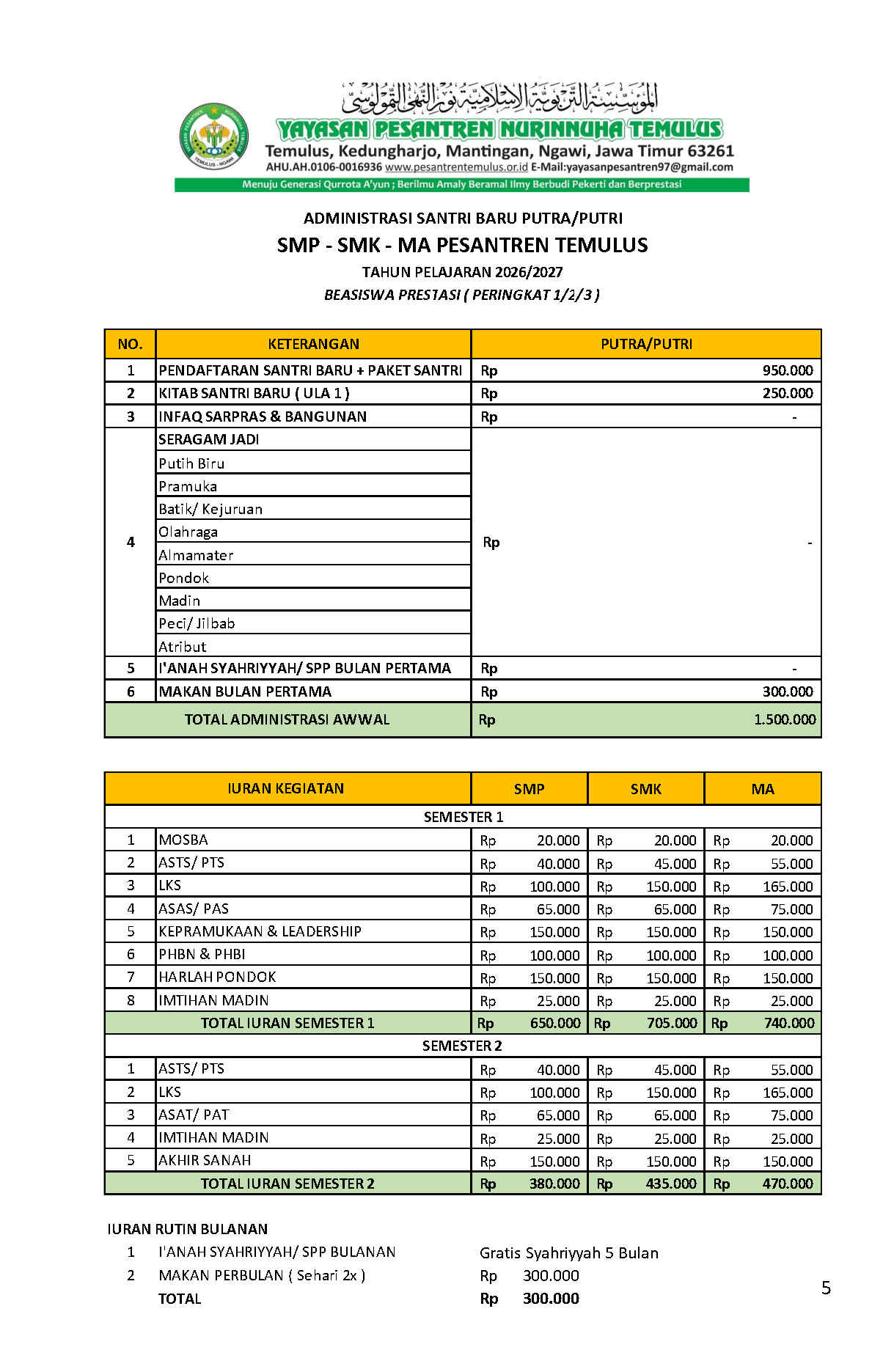 BIAYA PENDAFTAAN Pendaftaran Gelombang 1 (Diskon 50%) Pendaftaran Gelombang 2 (Diskon 25%) Pendaftaran Jalur Beasiswa Prestasi (Peringkat 1, 2, 3) Pendaftaran Reguler Dari SMP Pesantren Temulus Ke SMK/MA Pesantren Temulus Dari SMP Pesantren Temulus Ke SMK/MA Pesantren Temulus (Beasiswa Prestasi Peringkat 1, 2, 3)